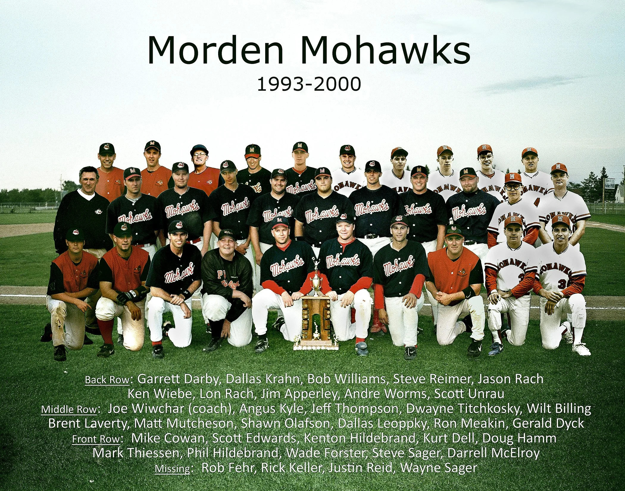 Beginning in 1987, the Morden Mohawks became dominant in their league. They not only won 11 consecutive Border League Championships, but over the next 14 years they would go on to win this championship 13 times. In 1994 they had a perfect 24-0 win/loss record in regular schedule and league playoffs, which earned them the Manitoba Baseball Team of the Year. The Mohawks competed in the majority of Provincial Senior “B” Championships and were a dominant supplier of players to the roster for Provincial “A” teams during this era. Morden players competed with the “A” team at the Western Canadian Championships in 1993, 1994, and 1997.