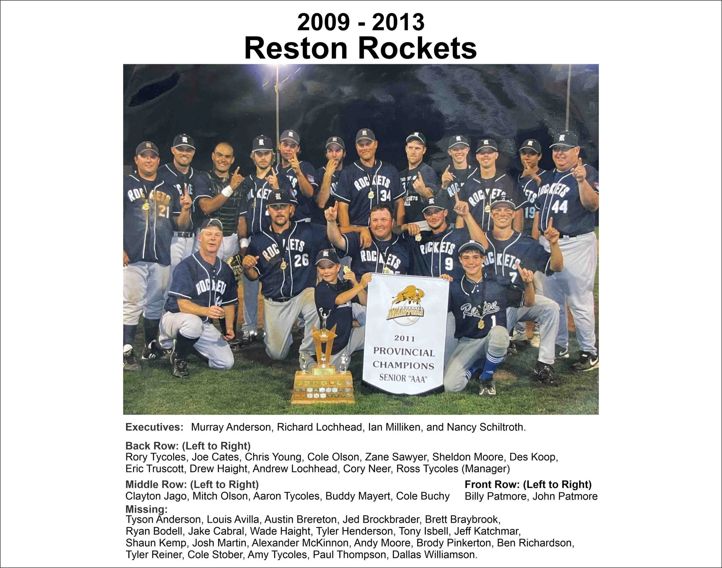 During the five years between 2009 and 2013, Reston won the MSBL batting title every year. Ross Tycoles was named MSBL Coach of the Year four times during the eight years Reston spent in the MSBL. Mitch Olson of the Rockets was Senior AAA Player of the Year in 2011 and 2013. Teammate Roy Tycoles won the same award in 2012. Reston’s players frequently appeared on the all-star teams of the time, and many former Rockets went on to be influential leaders and coaches in baseball across the province.